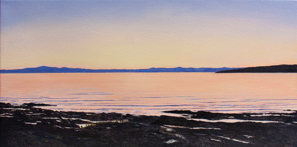 Peinture à l’huile sur toile représentant un coucher de soleil à la plage de Kamouraska, Québec.